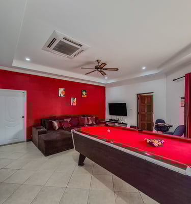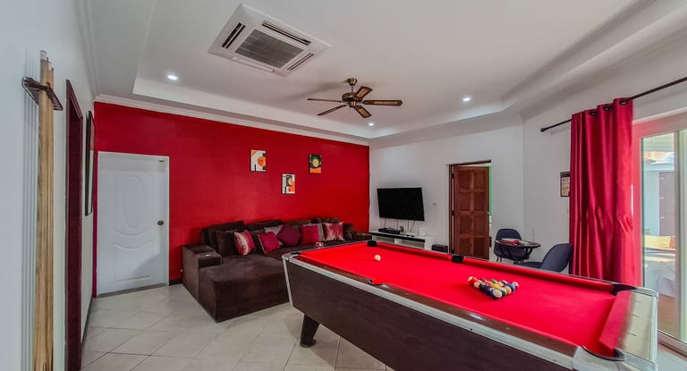 The villa includes a private swimming pool, BBQ area, karaoke system, and a snooker table, making it ideal for fun evenings without leaving the property. Designed for social stays, Flamingo Pool Villa comfortably sleeps up to 12 guests.