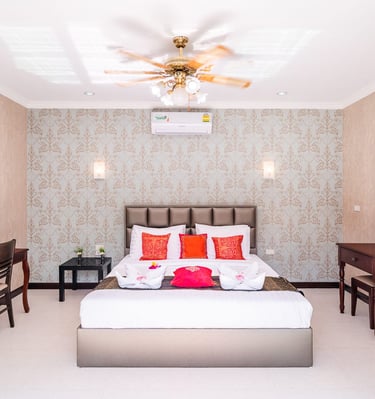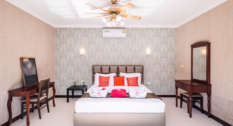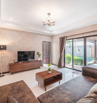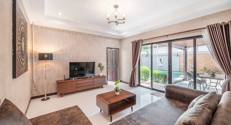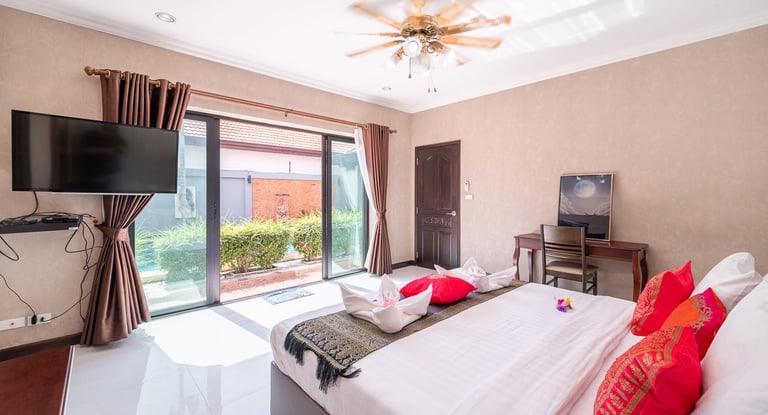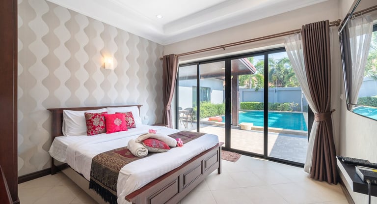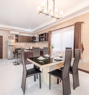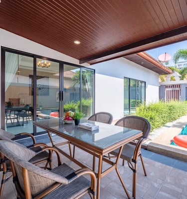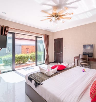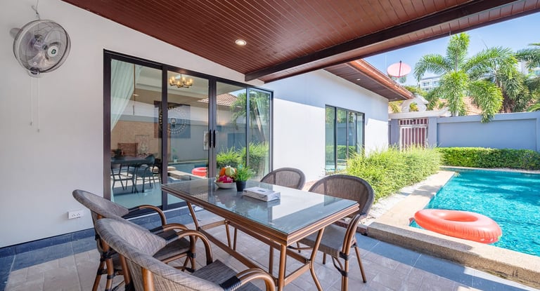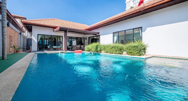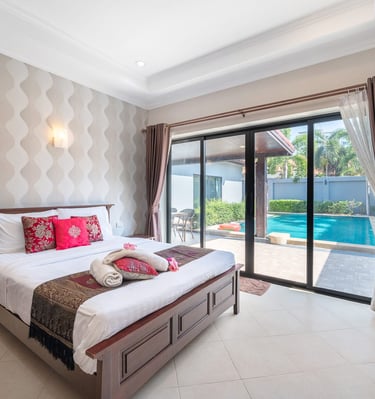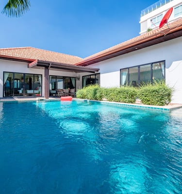 Mayfair Pool Villa is a stylish ground-floor private pool villa in Pattaya, ideal for families and relaxed group stays. All 3 bedrooms with ensuite bathrooms are located on the ground floor, making the villa convenient and accessible.