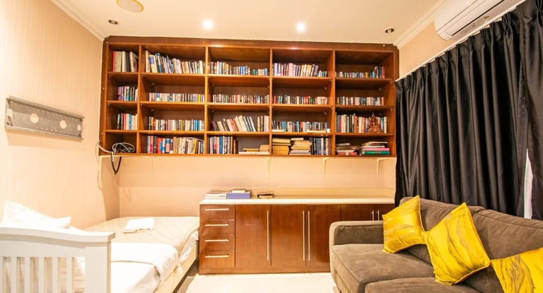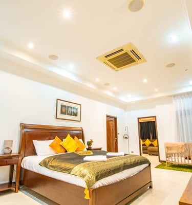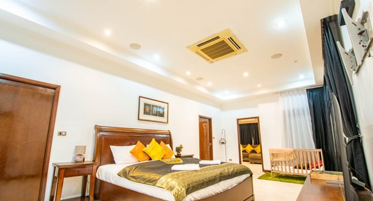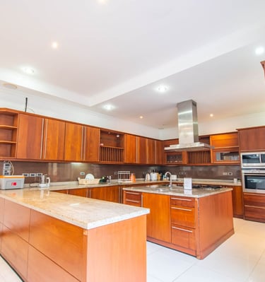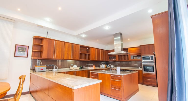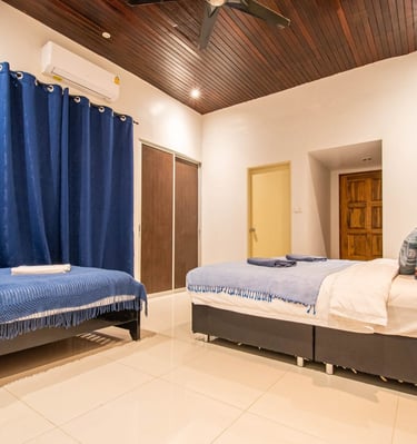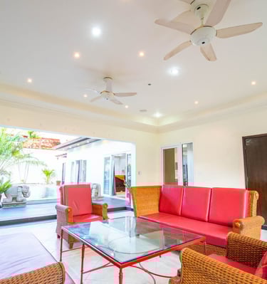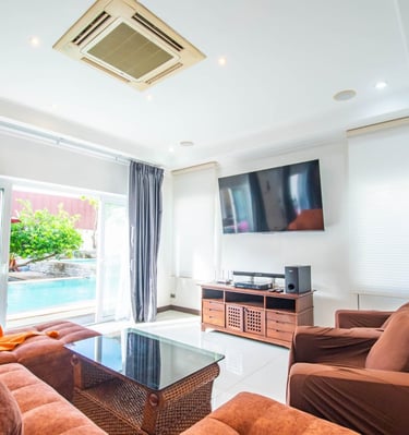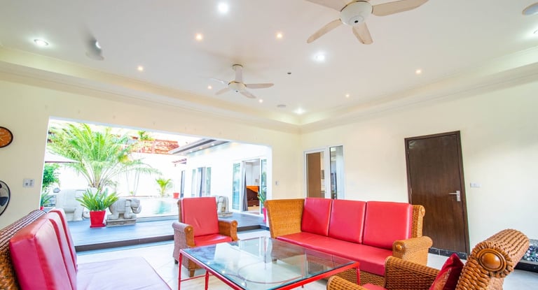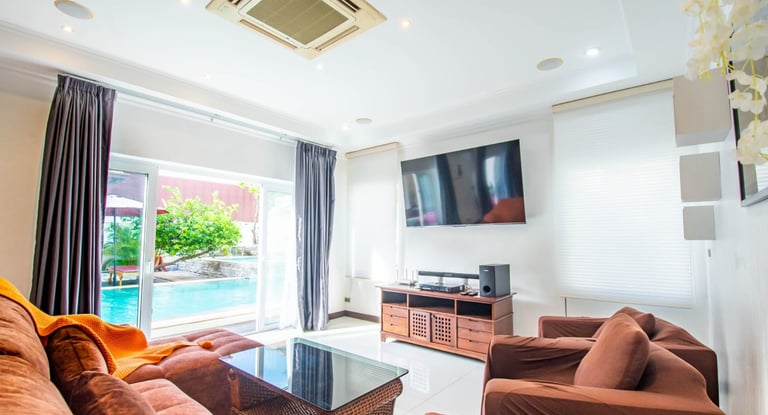 A massive living room with an oversized sofa and large TV makes it perfect for relaxing indoors, while the outdoor pools and beach proximity offer a true resort lifestyle. This villa comfortably accommodates up to 10 guests.