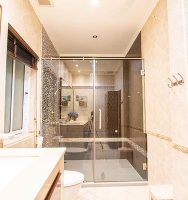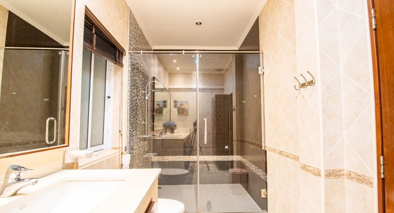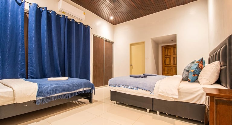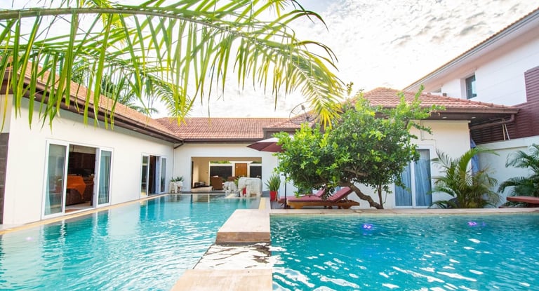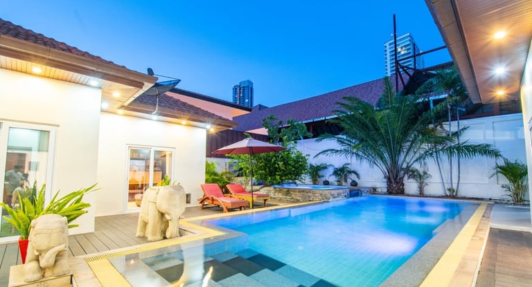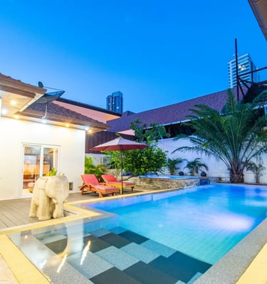 Seaside Pool Villa is a rare beachside villa in Pattaya with three private pools and direct access to the sea just 50 meters away. The villa features 3 large bedrooms with ensuite bathrooms plus an additional small bedroom/library with a detached bathroom.